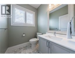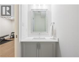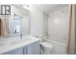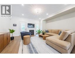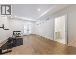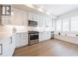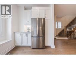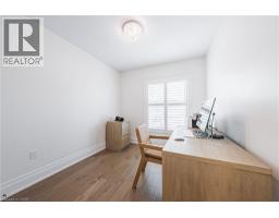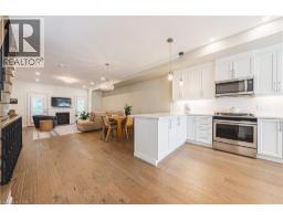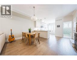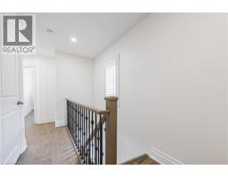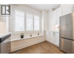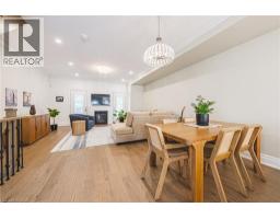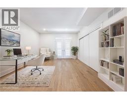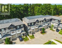 Stunning end unit town located in desirable sought after Ancaster village, walkable to coffee shops, fabulous dining, french bakery, summer farmers market, memorial arts centre, trails, schools, grocery and more! Meticulously maintained in like new condition, freshly painted with California shutters throughout, this home is turn key. The main level welcomes you from the covered porch into a flex space, currently used as home gym with double door walk out to exposed aggregate patio. Inside entry from garage. Convenient 2 piece bath with quartz counter. On the main level, you will find an elegant and exceptionally spacious living room/kitchen with 9 ft ceilings, crown moulding, hardwood floors. Living room is centred around gas fireplace with double door access to deck with bbq gas line and facing ravine. Dining area and kitchen peninsula offers ample room for entertaining. Crisp white kitchen with quartz counters, premium hardware, pearl finish textured tile backsplash, stainless steel appliances including gas stove, ample kitchen cabinet space with pantry. Main level 2 piece bath with quartz counter vanity and hexagon tile floor. Upstairs you will find three bedrooms, laundry, 2 full baths. Primary suite with walk in closet, ensuite with walk in glass shower, two large windows facing ravine. Additional 4 piece bath with quartz counter vanity and tub. No rental Items! Enjoy the Ancaster lifestyle with this beautiful move in ready home. (id:61594)