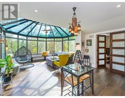 Nestled on a lush 1.67 acre lot in scenic Campbellville, this fully renovated 5 bedroom, 6.5 Bathroom bungalow perfectly blends contemporary farmhouse charm with luxurious resort-style living. Meticulously designed, this turnkey estate delivers an exceptional family estate and entertainer's paradise. Boasting over 6000 sq. ft. of finished living space, the gourmet chef's kitchen showcase top-of-the-line Thermador appliances, a Bosch built-in espresso machine, Miele double ovens, dual dishwashers, refined under-cabinet lighting - all seamlessly connected to a bright four-season sunroom, perfect for year-round enjoyment. The expansive primary suite provides a private sancturay featuring ensuite with dual rain shower heads with premium finishes. Main floor includes a dedicated spa wing with heated inground salt-water pool, hot-tub, sauna and fitness area with full bath, delivering an exclusive at-home wellness retreat. A private in-law suite offering a separate living room, bedroom with ensuite bath, and walk-in closet, perfect for multigenerational living or guest accommodation. The fully finished lower level includes a custom home theatre, bespoke live-edge bar, additional full bathroom, cedar-lined storage room, and secondary laundry - enhanced by designer millwork, barn doors, skylights, and upscale finishes throughout. Smart home technology is integrated via the Control4 system, offering complete automation and control of indoor and outdoor lighting as well as outdoor audio system, all accessible through a user-friendly app for seamless convenience. The professionally landscaped backyard is a true entertainer's dream, featuring a full outdoor kitchen, covered gazebo lounge, and cozy firepit area, surrounded by mature trees for ultimate privacy. Additional highlights include a detached barn, expansive manicured green spaces and a spacious three-car garage. (id:61594)