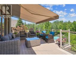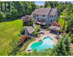Beautifully designed executive home offering over 5,700 sq ft of finished living space on a quiet court, with exceptional privacy and stunning treed views. The spacious main floor features an entertainers gourmet kitchen with full fridge and freezer, 48-inch range, hidden coffee bar, and an oversized island with seating for six+. The kitchen opens to the eat-in area and living room with hand picked stone fireplace, plus a formal dining room that seats 16+. Main-floor laundry and a convenient three-car garage with large driveway parking for approximately 8 cars. Upstairs you'll find five generous bedrooms and three full baths, including a luxurious primary suite with oversized ensuite, two walk-in closets, and a private exercise room. A second bedroom with its own ensuite is perfect for guests or family. The finished walk-out basement is designed for entertaining, with a full bar, pool table area, dance room, bathroom, and plenty of storage. Step outside to your backyard oasis featuring a sparkling pool with waterfall, diving rock, and fountains. Enjoy both a dedicated pool house and a separate outdoor living room with stone fireplace and cedar shake roof. Host gatherings at the built-in poolside barbecue and bar area, all surrounded by mature trees for ultimate seclusion. Natural gas is at the property rare for country living! (id:61594)