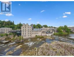 Luxury Living at The Elora Mill Residences! Introducing a turn-key luxury, corner suite in one of the most prestigious locations in the region. Professionally designed and furnished (all included), this fantastic residence offers a bright, airy open-concept layout with wraparound floor-to-ceiling windows, with custom privacy screening, stunning views of the Grand River and the Elora Mill, with three walkouts to an extraordinary 734 sq ft private wraparound terrace! The expansive modern kitchen features custom cabinetry, a huge waterfall-edge island with seating, and top-tier appliances including KitchenAid and a Fisher & Paykel built-in fridge/freezer. A stylish dining area flows seamlessly into the living room, complete with an elegant fireplace feature. The luxurious primary suite offers a large walk-in closet + second closet, and a spa-inspired ensuite with heated floors, double vanity, walk-in shower, and soaker tub. A second bedroom and full bathroom (also with heated floors) make the perfect retreat for guests. Additional features include in-suite laundry (Whirlpool), electric custom blinds, EV parking, and a storage locker. Enjoy resort-style amenities: concierge, lobby coffee bar, residents' lounge, private dining room, gym, yoga studio, fire-pit patios, and a spectacular outdoor pool and sun deck. Steps to Elora's shops, cafés, restaurants, trails, and parks, this rare ground-level suite with walkout terrace delivers unmatched luxury, convenience, and views - a truly exceptional offering in the heart of Elora. (id:61594)