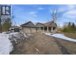 Welcome to this beautifully appointed custom-built ranch offering just under 2,000 sq ft of thoughtfully designed main floor living space, set on a private 1-acre country property backing onto bushland. The open-concept main level features a stunning Pioneer Cabinetry kitchen with quartz countertops, large centre island, corner pantry, and premium finishes, flowing into the bright great room with access to covered front and rear porches with stamped concrete accents. The spacious primary suite offers a luxurious ensuite with double vanity, walk-in tile shower, and soaker tub, and convenient main floor laundry adds everyday functionality. The finished lower level provides two generous bedrooms, a beautifully appointed bathroom with tiled walk-in shower and dual rainfall heads, and a large recreation room perfect for movie nights or family gatherings. The attached garage is fully insulated and heated and includes a 60-amp EV rough-in. A standout feature is the impressive 34’ x 60’ insulated shop with in-floor heating, 100-amp subpanel, LED lighting, overhead doors, and mezzanine — ideal for hobbies, storage, or recreational use. The backyard is a true retreat with a 15’ x 24’ heated concrete inground pool, expansive concrete decking, additional seating area, and a custom rear deck with recessed hot tub and privacy fencing. With covered porches, a livestock enclosure, outbuilding, and expansive outdoor space ideal for growing families and entertaining, this property offers the perfect balance of comfort, functionality, and country living just minutes from town. (id:61594)