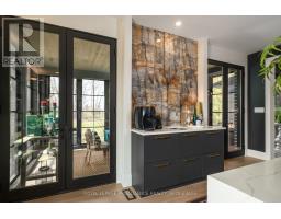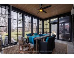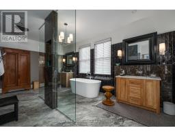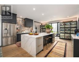 Exquisite and classic, this new home is located in an unbeatable downtown location, within walking distance to Queen's University, Kingston General Hospital, and Hotel Dieu Hospital. Built in 2023, this professionally designed 2.5-storey brick residence offers over 4,000 sqft of contemporary living space on a large, beautifully landscaped lot in one of Kingston's most sought-after neighbourhoods - Earls Court. Backing onto Oakridge Park with no rear neighbours, it's a true retreat in the heart of downtown. Every design element has been thoughtfully curated, from intricate tile work to antique doors that add timeless charm. The chef's kitchen features quartzite countertops, a double-wide waterfall island, induction cooktop, built-in oven, convection microwave, bar fridge, wet bar, and a bay window with a built-in breakfast seat. The open-concept kitchen, dining, and living areas face west and overlook the verdant backyard. Hardwood floors run throughout the house, while in-floor heating provides added comfort in the dining area, main floor bath, and primary ensuite. Two three-season porches open onto a terraced patio and expansive lawns surrounded by perimeter gardens. A versatile front room, currently an in-law suite with laundry and a four-piece bath, could also serve as an office. The gorgeous hardwood stairwell opens to the second floor and winds past a stunning mural designed with the home's colour palette. Upstairs is the primary suite, two additional spacious bedrooms each with private ensuites, a laundry room, and a large study with pivoting French doors. The primary suite wraps around the south end of the house and includes seven windows, a walk-through closet and an ensuite with a freestanding tub, walk-through shower, dual vanities, and heated floors. The finished third-floor vaulted bonus space is perfect for a kids room, office, or studio. Additional features include a crawlspace for extra storage, a heated two-car garage, and a large private driveway. (id:61594)