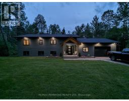 Beautifully appointed raised bungalow built by respected local builder, Dugan Hawkins, at 13 Rantz Road, where privacy, space, and convenience come together in one of Petawawa's most desirable upscale rural settings. Nestled on a 1.66-acre wooded lot, a peaceful retreat surrounded by nature while remaining close to town amenities. Outdoor enthusiasts will appreciate the quick drive to the boat launch at beautiful Black Bay on the Petawawa River. Vaulted ceilings, abundance of south-facing windows, patio doors all provide for great amounts of natural light to pour through the main living spaces. At the heart of the home is a remarkably spacious kitchen, it's U-shaped layout offers extensive modern cabinetry and miles of granite countertops, the long peninsula with overhang provides the perfect gathering place for casual meals, morning coffee, or conversation while meals are prepared. All four bedrooms offer comfortable proportions and a sense of space, ensuring everyone has room to unwind. Primary suite easily accommodates a king-size bed, features a walk-in closet along with a well-appointed 3-piece ensuite with shower. Fully finished lower level features a spacious recroom, anchored by a cozy wood stove and offers endless possibilities for relaxation & entertaining. Two of the four generously sized bedrooms are located on this level, including one currently serving as an ideal home office. Newly completed third bathroom showcases a striking glass-enclosed tile shower with elegant, spa-inspired finishes. Step outside to the expansive 16'x30' deck, accessed directly from the dining room, perfect for alfresco dining or relaxing while overlooking the tranquil wooded backyard and the lush green lawn with irrigation system. Attached 28'x30' garage is a standout feature-fully insulated and heated with its own propane furnace, creating a comfortable year-round workshop or hobby space. Grown-up Toy parking is plentiful as the driveway extends beyond the rear of garage! (id:61594)