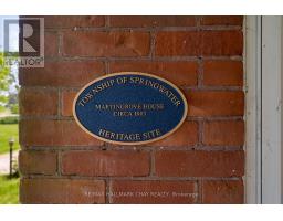 Welcome to Martingrove! One of springwaters designated Heritage homes. The handcrafted details are stunning, this home will call you... Built in 1906 on a private 2.57 acre property surrounded by mature trees and backing and siding onto a farm field. Sound of birds and tanquility. Original Wavy stained glass windows and stained glass transom windows with Fleur-de-lis above doorways. Hardwood flooring on main and upper. Solid field stone wood fireplace surround. Two bathrooms 3 piece on main and very large spa size bathroom on upper. Updated electrical, metal roof. The hand crafted railing and balusters are breath taking.Back staircase from kitchen with a gorgeous amber glass fixture and fleur de lis transom window. Wrap around porch for serene outdoor seating. Hot Tub off the back deck. Solar panel contract that draws income. This home is charming and grand. (id:61594)