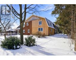 This beautifully updated 4.72-acre country property is set against a backdrop of open farmland and wide skies, providing plenty of privacy, mature trees, a secondary dwelling unit, a chicken coop, and multiple outbuildings, including a historic 1860s barn. The principal residence has been extensively remodeled, with over $130k in renovations and upgrades completed. A welcoming enclosed entry leads into a bright, open-concept living space created by opening up the original layout to enhance flow and functionality. Expansive front-facing windows, pot lights throughout, fresh paint, and updated flooring carried uniformly across the main level create a cohesive and modern aesthetic. The brand-new kitchen anchors the home, showcasing a large quartz island, white cabinetry with brass hardware, S/S appliances, a modern hood fan, and skylights. An extended wall of built-in cabinetry adds both storage and style. The kitchen connects seamlessly to the formal dining area, while a separate area with dark walls is ideal for a media room. The Main floor offers a full bathroom that was renovated in 2022 with a glass walk-in shower and contemporary finishes. Upstairs, updated flooring continues throughout. The primary suite is bright and inviting, featuring multiple windows and a walk-in closet. 3 additional bedrooms are well-proportioned and ideal for a growing family, while the fully renovated main bathroom features a freestanding soaker tub, a separate glass shower, and a double vanity. The attached farmhouse offers comfortable, self-contained living with its own kitchen, a living room with a charming wood stove, a dining room, 2 second-level bedrooms, and a 4-piece bathroom. The attached garage features an updated concrete slab, while the private deck includes a gazebo and a hot tub patio overlooking the expansive yard and surrounding farmland. Life here unfolds at a slower, more intentional pace - fresh air, stunning sunrises and sunsets, and star-filled skies await! (id:61594)