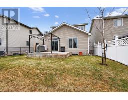 This beautiful two-storey Caraco home offers 3+1 bedrooms and 3.5 bathrooms, thoughtfully designed for comfortable and refined family living. The upper level features nine foot ceilings, a spacious primary suite complete with a walk-in closet and private ensuite, two generously sized bedrooms and a well-appointed full bathroom. The main floor is bright and welcoming, highlighted by vaulted ceilings in the living room, a cozy gas fireplace, and a stylish kitchen featuring a quartz countertops. A private office at the front of the home provides a perfect workspace, while main floor laundry adds everyday convenience. Patio doors lead to a south facing deck overlooking the fully fenced backyard - an ideal setting for relaxing or entertaining. An attached double car garage and paved driveway complete the level. The finished lower level offers excellent versatility, with a large recreation room, an additional bedroom, a full bathroom and a utility room - perfect for guests, extended family, or additional living space. Equipped with a high efficiency natural gas furnace and hot water on demand, this home blends comfort, efficiency and timeless style throughout. (id:61594)