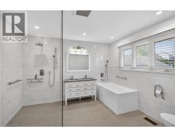Nestled on a quiet cul-de-sac in the heart of Hamilton’s sought-after Delta neighbourhood, this tastefully updated 2 bedroom, 2 bathroom bungalow offers comfort, convenience, and exceptional versatility. Featuring surfaced parking for 4 vehicles and a single garage with inside entry, this home delivers both function and ease from the moment you arrive. A covered front porch welcomes you into a spacious foyer complete with a convenient storage closet. The inviting living room is filled with natural light from an expansive front window and enhanced with pot lighting, creating a warm and airy atmosphere. The eat-in kitchen offers a charming dinette space, stainless steel appliances, and a skylight that floods the area with natural light. Two generously sized bedrooms feature oversized closets, while the recently renovated 5-piece bathroom is a standout - thoughtfully designed to be wheelchair accessible, complete with a glass shower, double vanity, and an oversized soaker tub. Main level laundry adds everyday convenience. The partially finished lower level expands your living space with a large recreation room, cold room, powder room, utility area, and a second laundry setup. A bonus side entrance provides direct access to both levels, offering excellent in-law or multi-generational living potential. Step outside to a private backyard retreat featuring a large concrete patio with veranda, a rear storage shed, gardens, and green space to enjoy. Additional updates include roof shingles (2021), recently installed flooring, upgraded lighting fixtures, fresh paint throughout & more. Located in the vibrant Delta community, enjoy close proximity to Gage Park, Ottawa Street’s shops and restaurants, schools, transit, and quick highway access. A rare opportunity to own a turnkey bungalow in one of Hamilton’s most established neighbourhoods. (id:61594)