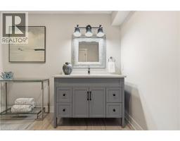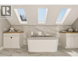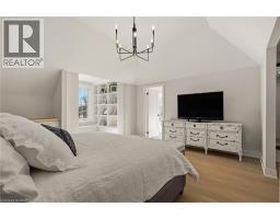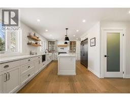 Tucked onto an oversized, beautifully landscaped corner lot in a desirable Ancaster neighbourhood, this stunning Cape Cod–inspired home has been completely transformed with sophisticated, high-end renovations throughout. The curb appeal is undeniable — a circular drive with parking for up to 10 vehicles, double garage, and charming front porch create the perfect place to relax and take in the neighbourhood. Inside, rich hardwood floors flow throughout the main level, leading into a bright, open dining room. The chef-inspired kitchen is a showstopper, featuring a 6-burner gas range, apron sink, full-size fridge and freezer, custom cabinetry, and island that seamlessly connects to the dinette and welcoming living room. A striking fireplace anchors the soaring vaulted ceiling with exposed beam, while large windows and a walk-out invite natural light and effortless access to the private backyard. A dedicated home office, powder room, laundry room, and convenient inside entry to the garage complete the thoughtfully designed main floor. Upstairs, solid wood stairs with sleek glass railings lead to a truly luxurious primary retreat. This spa-inspired suite features a cozy reading nook, two generous walk-in closets, and an elegant 5-piece ensuite with double vanity, soaker tub, and walk-in glass shower. Two additional spacious bedrooms with full wardrobes and a beautifully appointed 4-piece bathroom complete the upper level. The lower level offers additional living space with engineered hardwood throughout the large rec room, perfect for both media and games, complete with wet bar for entertaining. A fourth bedroom with walk-in closet and private 4-piece ensuite makes an ideal guest or teen retreat. Wine enthusiasts will appreciate the impressive wine cellar reminiscent of a private winery. The backyard oasis features a full-length patio, landscaping, and garden shed - an exceptional space that's perfect for family gatherings. Luxury and comfort seamlessly come together. (id:61594)