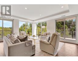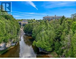 This luxurious 1,979 sq ft, 2-bedroom plus den corner suite is in the most desired location in the building. An additional 500 sq ft of outdoor living space and wrap-around windows give spectacular views in every season.. stunning water views of the Grand River, Gorgeous Elora Mill and the Scenic Tranquil views of the Elora Gorge. The main living area features a kitchen with floor-to-ceiling custom cabinetry, Upgraded Miele appliances, a walk-in pantry, a large island with a waterfall countertop, and seating for four. The spacious dining room provides ample room for a large dining table perfect for hosting dinner parties or family dinners. The bright living room is open and easily accommodates larger furniture making this suite ideal for downsizers. The impressive primary suite boasts river views, two walk-in closets, and a five-piece ensuite bath with a double vanity, a gorgeous soaker tub with chandelier and a separate shower. This ideal layout also has a second wing with an additional bedroom and bathroom for guests, providing privacy. A spacious den with a door offers a versatile bonus room, perfect for a home office, guest room, or home theater. The Luxury Elora Mill Residences offer resort-style living, complete with a concierge, lobby coffee bar, resident lounge, private dining/party room, gym, yoga studio, outdoor terrace with fire pits, and an incredible outdoor pool with spectacular river views. Just steps from Elora's charming downtown, you'll find top restaurants, shops, and cafes to explore, as well as quick access to the trails along the Elora Gorge in this amazing walking community. Two underground parking spots and a locker complete this ideal luxury home, offering low-maintenance, resort-style living. (id:61594)