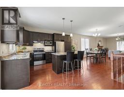 Tucked away on a quiet, cul-de-sac, this home offers a calm setting just steps from Kemptville's downtown amenities and schools. The front porch is a great spot to sit and unwind at the end of the day.Inside, the main floor is bright and open, with large windows pulling in tons of natural light. This accessible bungalow is thoughtfully designed for ease of movement, with everything you need conveniently located on one level. The layout flows easily between the kitchen, dining, and living areas, making it ideal for hosting or just everyday life. A gas fireplace adds a cozy focal point to the living space, while the kitchen features a breakfast bar, rich cabinetry, and access to the backyard.You will find 2 bedrooms on the main level, including a spacious primary with a beautifully updated ensuite and walk-in closet. The laundry room is conveniently located on the main floor with direct access to the garage.Downstairs offers even more flexibility, with a 3rd bedroom, additional finished space that can be used however you need (family room, office, or extra bedroom), a powder room, and plenty of storage.Backing directly onto a school, there are no direct rear neighbours, and lots of mature trees. Bonus features include a Generac backup generator and on-demand hot water for added comfort and peace of mind.Bright, functional, accessible and set in a great location! (Quality Lockwood Brothers build) This bungalow checks all the boxes. (id:61594)