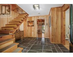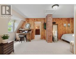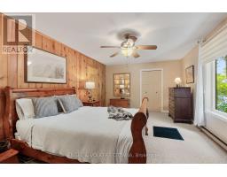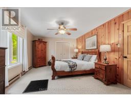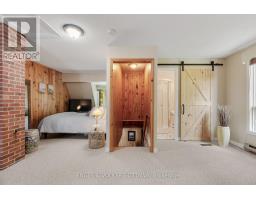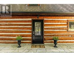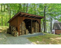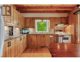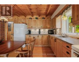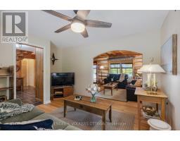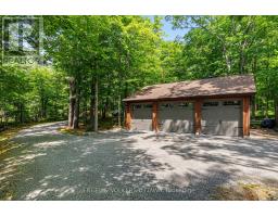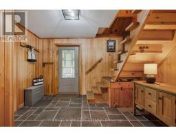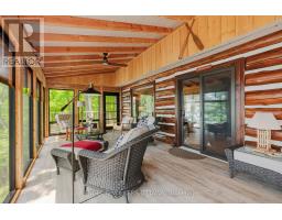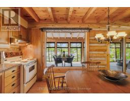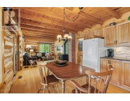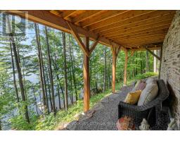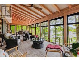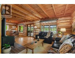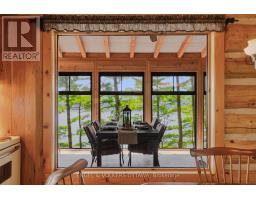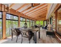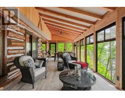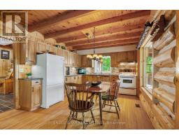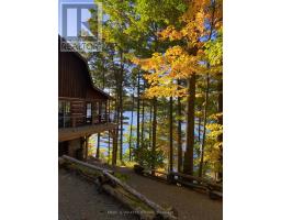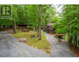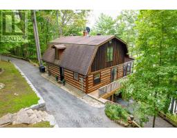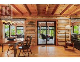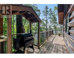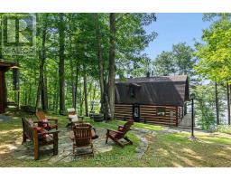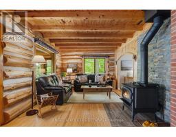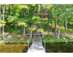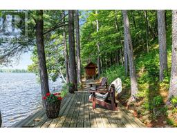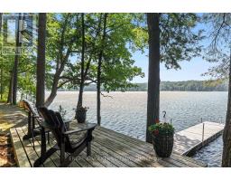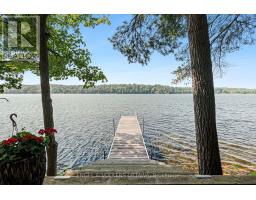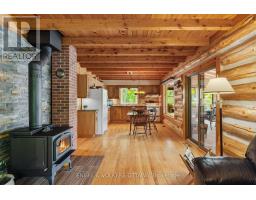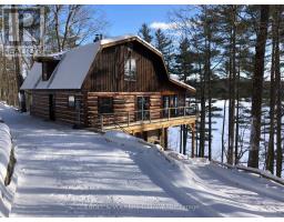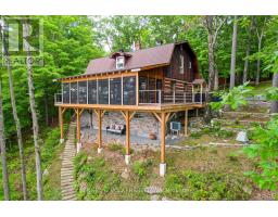 300.47 ft of waterfront property nestled on a quiet private lane along the pristine shores of Big Crosby Lake, in a welcoming and well-established gated lakeside community! This custom-built log home provides a four-season tranquil retreat, ideal for nature lovers and outdoor adventurers on a 299.79 ft x 260.65 ft lot. The main level welcomes you to a spacious foyer with tile flooring and tongue-and-groove hardwood walls, which leads to an open-concept family room and eat-in kitchen, unified by hardwood flooring, exposed beams, and a freestanding wood stove with a stacked stone surround. The custom Butternut kitchen looks out to both the treed property and the beautiful lake, while the sliding glass door leads to the massive 3-season screened-in porch. Upstairs, the primary bedroom has soft carpeting, natural wood accents, and dual closets, while the expansive second-level living area has flexibility as additional bedrooms, a workspace, or a creative studio. A bathroom on each level, both updated in 2021, completes the interior of the home. Outside, a large wood storage shed, a firepit area, walking paths, and a three-car detached garage are all found in the wooded portion of the property. On the lakeside, wide elevated decks run along both sides of the home, while just below the sunroom, a gravel terrace provides a shaded gathering area with access to the private, low-maintenance stone path leading to the lakeside deck and private dock. Big Crosby Lake is spring-fed and home to bass, pickerel, and a variety of panfish, offering exceptional swimming, fishing, and boating. Located just 1 km from pavement, Connies Lane is a quiet, walkable road with only 12 cottages and no further development - maintained by a stable group of long-term owners, making this home a quiet, unforgettable lakeside experience. Some photos have been virtually staged. (id:61594)