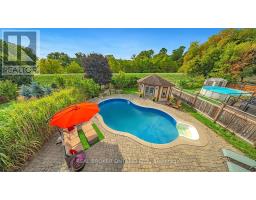 Set on a private court in Holmedale, one of Brantfords most desirable neighbourhoods, 23 Jamieson enjoys a rare position backing onto the Grand River and trail system. This is a home designed for those who value both sophistication and the outdoors, with a complete lifestyle package of open living spaces, a resort-style yard, and direct access to miles of trails for walking, biking, or paddling. The main floor flows seamlessly from a formal dining area at the front of the home into a chefs kitchen with stainless steel appliances and breakfast bar, the living rooms is anchored by a natural gas stone fireplace and walls of windows overlooking the pool. A den with wall-to-wall built-ins and wet bar overlooks the yard, while two additional bedrooms, a full bath, and laundry with garage access add everyday function. The sweeping staircase rises to a dramatic upper landing where the primary suite offers a walk-in closet and spa-inspired 5-piece ensuite. An upper living room with skylight, library wall, and wet bar opens to a massive deck with panoramic river views. Outside, double-tiered decks step down to a landscaped backyard with an in-ground kidney pool, pool house, and mature trees framing the valley. Beyond the property line, discover a secluded trail-access beach and all that Holmedale has to offer, from the art crawl to local favourites like Fume and Shack Bar, with the Brantford Golf and Country Club and Glenhyrst Art Gallery just minutes away. This is the one. (id:61594)