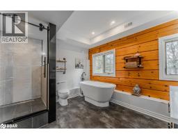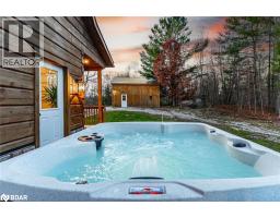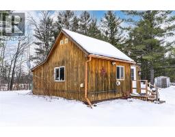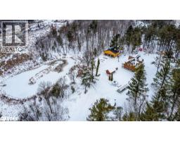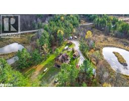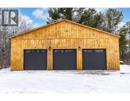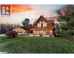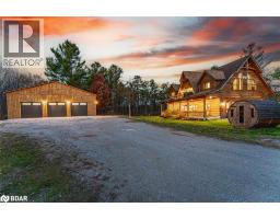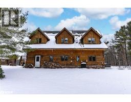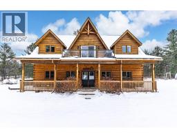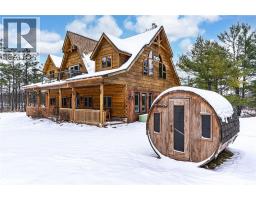 100 ACRES OF NATURAL BEAUTY & A LUXURIOUSLY UPDATED LOG HOME WITH OWNED SOLAR PANELS & VERSATILE OUTBUILDINGS INCLUDING AN OVERSIZED HEATED TRIPLE CAR GARAGE, A SAUNA, SHED, 26FT PLANTA METAL GREENHOUSE, CHICKEN COOP, PUMP HOUSE, A HUNT CAMP & BUNKIE WITH A KITCHEN, BATHROOM, HEATING & A/C! Experience true country living in this log home tucked away on 100 acres with ponds, trails, and forest views, offering the ultimate in peace, privacy, and natural beauty. Showcasing timeless rustic charm, this home features a freshly re-stained log exterior and a full-length front porch, perfect for taking in the serene surroundings. Possibilities are endless with the bunkie- ideal for business or rental use and potential for severance (subject to township approval). Outdoor living shines with a sauna, hot tub, chicken coop, fruit trees, garden beds, and a summer gazebo for unwinding in the fresh air. The main level features a cozy family room with a propane fireplace, two bedrooms with walkouts including a luxurious primary suite with a 5-piece ensuite, a 3-piece bathroom with heated floors, and a flexible office space. The upper level boasts vaulted ceilings, engineered hardwood, and an open-concept kitchen and dining area with quartz counters, tile backsplash, a large island, and stainless steel appliances. The great room features a wood fireplace, statement windows, and a balcony walkout with forest views, plus an additional bedroom and a renovated 5-piece bath. Recent upgrades include fresh interior paint, LED lighting, refinished stairs, newer door hardware, efficient windows, central vac, and a water filtration system. A solar panel system with battery backup and generator hookups ensures dependable off-grid capability, while newly added Bell Fibe internet keeps you seamlessly connected. Discover the ultimate retreat where luxury, modern comfort, and nature unite in perfect harmony, creating a truly exceptional #HomeToStay. (id:61594)