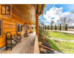 100 ACRES OF NATURAL BEAUTY & A LUXURIOUSLY UPDATED LOG HOME WITH OWNED SOLAR PANELS & VERSATILE OUTBUILDINGS INCLUDING AN OVERSIZED HEATED TRIPLE CAR GARAGE, A SAUNA, SHED, 26FT PLANTA METAL GREENHOUSE, CHICKEN COOP, PUMP HOUSE, A HUNT CAMP & BUNKIE WITH A KITCHEN, BATHROOM, HEATING & A/C! Experience true country living in this log home tucked away on 100 acres with ponds, trails, and forest views, offering the ultimate in peace, privacy, and natural beauty. Showcasing timeless rustic charm, this home features a freshly re-stained log exterior and a full-length front porch, perfect for taking in the serene surroundings. Possibilities are endless with the bunkie- ideal for business or rental use and potential for severance (subject to township approval). Outdoor living shines with a sauna, hot tub, chicken coop, fruit trees, garden beds, and a summer gazebo for unwinding in the fresh air. The main level features a cozy family room with a propane fireplace, two bedrooms with walkouts including a luxurious primary suite with a 5-piece ensuite, a 3-piece bathroom with heated floors, and a flexible office space. The upper level boasts vaulted ceilings, engineered hardwood, and an open-concept kitchen and dining area with quartz counters, tile backsplash, a large island, and stainless steel appliances. The great room features a wood fireplace, statement windows, and a balcony walkout with forest views, plus an additional bedroom and a renovated 5-piece bath. Recent upgrades include fresh interior paint, LED lighting, refinished stairs, newer door hardware, efficient windows, central vac, and a water filtration system. A solar panel system with battery backup and generator hookups ensures dependable off-grid capability, while newly added Bell Fibe internet keeps you seamlessly connected. Discover the ultimate retreat where luxury, modern comfort, and nature unite in perfect harmony, creating a truly exceptional #HomeToStay. (id:61594)
