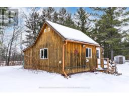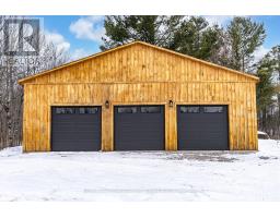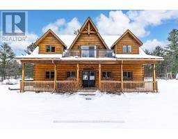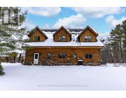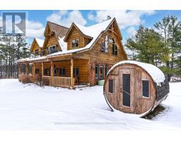 100 ACRES OF NATURAL BEAUTY & A LUXURIOUSLY UPDATED LOG HOME WITH OWNED SOLAR PANELS & VERSATILE OUTBUILDINGS INCLUDING AN OVERSIZED HEATED TRIPLE CAR GARAGE, A SAUNA, SHED, 26FT PLANTA METAL GREENHOUSE, CHICKEN COOP, PUMP HOUSE, A HUNT CAMP & BUNKIE WITH A KITCHEN, BATHROOM, HEATING & A/C! Experience true country living in this log home tucked away on 100 acres with ponds, trails, and forest views, offering the ultimate in peace, privacy, and natural beauty. Showcasing timeless rustic charm, this home features a freshly re-stained log exterior and a full-length front porch, perfect for taking in the serene surroundings. Possibilities are endless with the bunkie- ideal for business or rental use and potential for severance. Outdoor living shines with a sauna, hot tub, chicken coop, fruit trees, garden beds, and a summer gazebo for unwinding in the fresh air. The main level features a cozy family room with a propane fireplace, two bedrooms with walkouts, including a luxurious primary suite with a 5-piece ensuite, a 3-piece bathroom with heated floors, and a flexible office space. The upper level boasts vaulted ceilings, engineered hardwood, and an open-concept kitchen and dining area with quartz counters, tile backsplash, a large island, and stainless steel appliances. The great room features a wood fireplace, statement windows, and a balcony walkout with forest views, plus an additional bedroom and a renovated 5-piece bath. Recent upgrades include fresh interior paint, LED lighting, refinished stairs, brand new flooring, newer door hardware, efficient windows, central vac, and a water filtration system. A solar panel system with battery backup and generator hookups ensures dependable off-grid capability, while newly added Bell Fibe internet keeps you seamlessly connected. Discover the ultimate retreat where luxury, modern comfort, and nature unite in perfect harmony, creating a truly exceptional #HomeToStay. (id:61594)