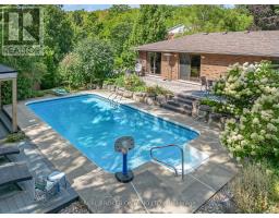 Welcome to a rare opportunity in one of Waterdown's most peaceful, family-oriented neighbourhoods. Tucked away from through traffic, this quiet and private 3+1 bedroom, 2+2 bathroom home offers over 3,000 total sq ft of thoughtfully designed living space on a mature, beautifully landscaped lot. Inside, you'll find acacia engineered hardwood flooring, quartz kitchen countertops, updated bathrooms, newer windows and patio doors, along with a new furnace and A/C. The spacious recreation room with custom bar is perfect for entertaining, while the backyard oasis features a heated saltwater pool, stamped concrete patio, and lush perennial gardens. An extra-long driveway and full-sized double garage provide ample parking, with space for an RV or boat. A true family home in a one-of-a-kind Waterdown setting. (id:61594)