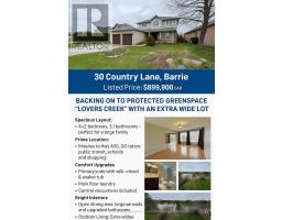 A rare opportunity to own a spacious 4 bedroom, 2.5 bath family home on popular Country Lane featuring an extra wide lot backing onto protected Lovers Creek greenspace, offering privacy and natural beauty while still being just minutes from Hwy 400, the GO station, buses, schools, and shopping; highlights include a bright main floor laundry, walk-in closet and soaker tub in the primary suite, built-in shelving, central vac, appliances and window coverings included, as well as perennial gardens and inviting living spaces that make this the perfect blend of comfort, convenience, and charm. (id:61594)