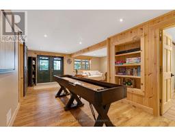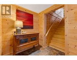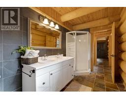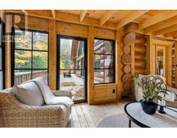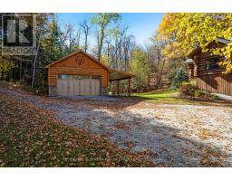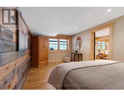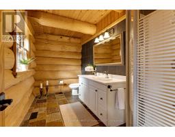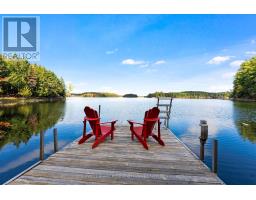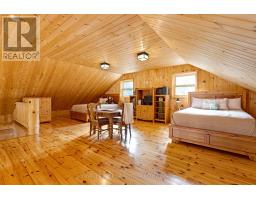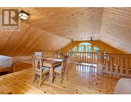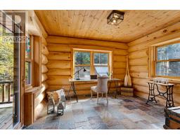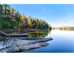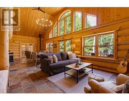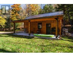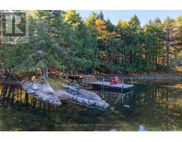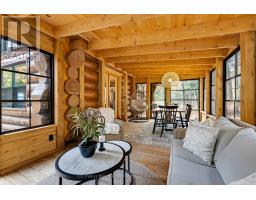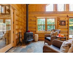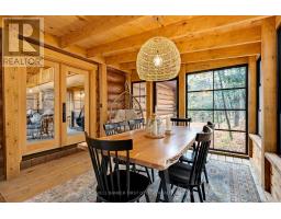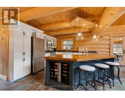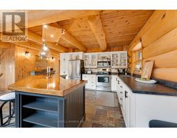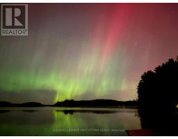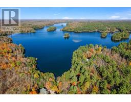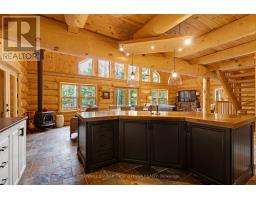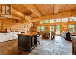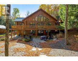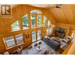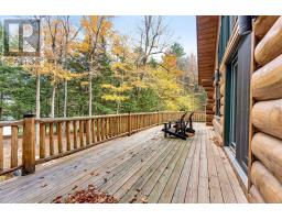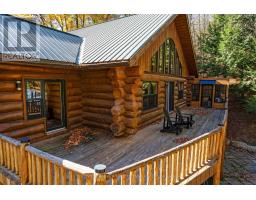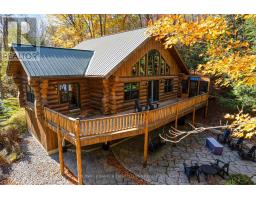 Lakefront luxury living on 6 lovely acres along Bennett Lake. Located in prestigious Bennett Lake Estates, exceptional walkout Scandinavian log home with traditional warmth of log construction while offering bright contemporary spaces. The 4bed, 2 full bath home's honey-hue logs create light-filled airy rooms that enhance the grand open floor plan. Welcoming wrap-about deck opens to Great Room and kitchen featuring impressive slate floors and efficient Jotul fireplace stove. Cathedral ceiling 16' high, wall of soaring windows and garden doors to extensive, entertainment-sized, deck. Gleaming kitchen showcases upscale white cabinetry including elegant glass display cabinets; the complementary ebony toned island-breakfast bar is designed for casual dining or family gatherings. Sun soaked den/office has windows on all sides and garden door to upper deck. Wonderful sunroom with cascading Weatherwall windows and access to upper deck. Main floor primary bedroom and 4-pc bathroom with slate floor, two-sink vanity plus shower with slate wall. Upstairs is huge open loft for flex space or bedroom, with finished pine plank flooring. Lower level family room walkout double doors to covered stone patio with picture-perfect views of the lake. Lower level also has rec room, two bedrooms with sliding barn doors and 4 pc bathroom of porcelain sink, extra deep soaker tub plus rainhead glass shower. Detached double garage 60 amps with 250V, concrete floor and overhead heater. Attached to garage is charming covered porch, for times of quiet reflection. Both home & garage have metal roof. Waterfront 319', sandy, rocky and natural. Shoreline is shallow and then deepens. End of dock 8-10' for swimming, fishing & boating. Bennett Lake connects to Fagan Lake for extended boating. As resident of Bennett Lake Estates, you have deeded shared access to the community's two private waterfront lots, one with a boat launch. Private road with maintenance and snow plowing $450/year. 30 mins to Perth (id:61594)