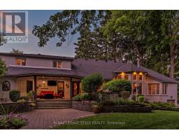 Located on a quiet court in Ancaster's prestigious Oakhill neighbourhood, 34 Harrington Place is a one-of-a-kind bungaloft designed for elegant living and unforgettable entertaining. Set on a pie-shaped, nearly half-acre lot with an impressive 217 ft across the rear, this custom-built Atherton home is surrounded by estate properties and award-winning Trillium gardens that elevate the curb appeal and outdoor experience. Boasting almost 5,000 sqft of impeccably finished living space, this home offers 3+1 bedrooms, 4 full baths, and a layout that perfectly blends everyday comfort with timeless sophistication. The main floor features a gourmet eat-in kitchen with custom cabinetry, cathedral ceiling, and access to a covered porch, flowing into a striking 12-ft great room with gas fireplace and floor-to-ceiling windows overlooking the oasis backyard. A formal dining room provides the ideal setting for hosting family gatherings and elegant dinner parties. The luxurious main-floor primary suite includes a cozy gas fireplace, an oversized walk-in dressing room, and a 5-pc spa-inspired ensuite. Also on the main level: a large private office, a full laundry room, and a stylish guest bath with direct outdoor access-perfect for rinsing off after a dip in the custom-designed hot and cold soaker pool spa or post-garden clean-up. Upstairs, two well-appointed bedrooms, a full bath, and a versatile loft area offer space for teens, guests, or a second home office. The bright walk-out basement features a 3-sided gas fireplace, spacious recreation room, kitchenette/bar, 4th bedroom, full spa bath, gym area, and abundant storage-ideal for in-laws or extended family. The backyard is a showstopper: private, lush, and tailored for gatherings large or small. Multiple seating and dining areas, a covered porch, and the signature pool spa create an outdoor sanctuary you'll enjoy in every season. This is more than a home-it's a statement of lifestyle in one of Ancaster's most exclusive enclaves. (id:61594)