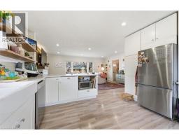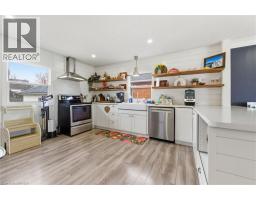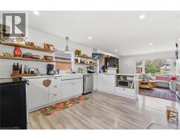 Welcome to 34 Scrimger Avenue—a fully renovated detached bungalow tucked into a desirable, mature East Galt neighborhood. The kind of home buyers wait for: stylish, move-in-ready, and set on a large, fully fenced yard with mature trees, plus a detached garage and wide driveway. Step inside and you’ll feel it immediately—warm, open-concept living with a bright front window and a stunning white brick gas fireplace as the focal point. The 2018 kitchen renovation delivers clean modern finishes with a breakfast bar, open shelving, and shiplap details—ideal for hosting, homework at the counter, or easy everyday living. The main level is completed with modern flooring, two generous bedrooms, and a beautifully updated bathroom featuring in-floor heating. The lower level was updated with vinyl flooring, windows, a new 3-piece bathroom, and a spacious third bedroom with a walk-in closet—perfect for guests, teens, or a private home office. There’s also additional space for a rec room, gym, playroom, storage and workshop. Outside is where this property shines: a large deck (2019) creates the ultimate backyard setup for BBQs, entertaining, or unwinding under the shade of a gorgeous maple tree. Major updates add peace of mind: main floor windows 2018, basement windows 2020, steel roof 2018. Close to parks, trails, schools and amenities—this is the complete package. Homes like this don’t last. (id:61594)