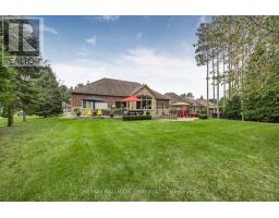 Barrie House Hub presents 36 Lilac Lane, an exceptional custom luxury bungalow in Midhurst. Built with top-tier materials and a high-efficiency ICF construction, this home offers superior comfort, durability, and energy savings. With over 5,400 sq ft of finished living space, this open-concept bungalow is designed for refined living and effortless entertaining.The stunning great room features soaring cathedral ceilings, a statement gas fireplace, and expansive panoramic windows overlooking the fully landscaped backyard, ravine, and backing onto Willow Creek. Natural light fills the space, creating a seamless connection between indoors and out.The chef's kitchen is a true showpiece, equipped with premium Sub-Zero fridge and freezer, Miele built-in oven, steam oven, and coffee maker, induction cooktop with pot filler, and an impressive nearly 11-foot quartz island-perfect for hosting and gathering. Crown moulding and built-in speakers enhance the main level throughout.The primary suite is a private retreat featuring a walk-in closet and a spa-like ensuite. Two additional bedrooms are thoughtfully positioned at opposite ends of the home, sharing a beautifully finished bathroom with stone countertops, plus a stylish powder room.The fully finished lower level offers nearly 9-foot ceilings, a striking stone feature wall, a home theatre with wet bar, a large laundry/sewing room, bedroom, bathroom, office, and workout area. Radiant in-floor heating throughout the basement ensures year round comfort. An oversized insulated garage includes two Tesla chargers. The separate basement access makes this home a candidate for extended family living. The private backyard oasis features large gorgeous stone patio a built-in firepit and hot tub, ideal for morning coffee or evening entertaining while overlooking the ravine. Close to Highway 400, RVH, and shopping, yet tucked away on a quiet cul-de-sac, this luxury Midhurst home delivers exceptional quality, privacy, and lifestyle. (id:61594)