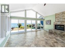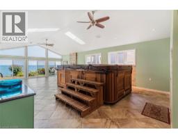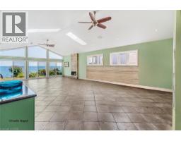 Welcome to 38 Lakeside Drive, Grimsby – a raised ranch-style home backing directly onto Lake Ontario. A 2013 addition created a spacious main-floor family room and an oversized single garage. The family room features floor-to-ceiling windows with lake views, a cathedral ceiling with 2 skylights and ceiling fans, a gas fireplace, wet bar, tile floors, and a built-in 14-foot, climate-controlled Arctic swim spa for year-round use. Sliding doors open to a Flex Stone patio (2022) and the deep backyard. The upper level has 2 bedrooms, a 4-piece bathroom with heated floors, linen closet, jetted tub, and a granite counter. The living room has crown moulding, pot lights, and sliding doors to a balcony with composite decking and glass railings overlooking the backyard and lake. The updated eat-in kitchen includes cherrywood cabinets, granite counters, breakfast bar, double sink, south-facing windows, pot lights, pull-out pantry, dining area with display cabinets, and upgraded stainless steel appliances including a gas range with double ovens, built-in microwave, and dishwasher. The lower level, also renovated in 2013, includes 2 additional bedrooms, a 4-piece bathroom with heated floors and linen closet, a rec room, and a large laundry/utility/storage room with cabinetry, shelving, and a second fridge. One bedroom has a walk-up to the backyard. Additional features include: 200 Amp hydro, central vacuum, irrigation system by Water World, Eufy wireless security system with 3 cameras, pot lighting at the front and rear with rear motion detector, leaf guards, oversized garage with inside entry, extra storage, automatic garage door opener with 2 remotes, and two storage sheds. A 10' x 10' sitting area with firepit overlooks the lake, and with Lake Ontario riparian rights, there is potential to add a deck or dock for more direct water access. Peace and privacy, yet close to shopping, parks, schools, and easy highway access. Swim spa can be removed by sellers if preferred. (id:61594)