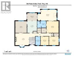LUXURIOUS GEORGIAN BAY ESTATE WITH 83 FT OF SANDY SHORELINE, SECOND COTTAGE, DETACHED GARAGE & ALMOST HALF AN ACRE! 83 feet of Georgian Bay frontage with eastern exposure presents a private sandy beach with gradual entry, clear waters, and sunrise views that define the waterfront lifestyle. Set on nearly half an acre with a large back deck, the property is further enhanced by an expansive L-shaped dock with a bump-out that extends into the bay, offering an impressive setting for entertaining, lounging, and docking motorcraft. Located on a coveted cul-de-sac along sought-after Peek-A-Boo Trail and just steps from Tee Pee Point Park, the property delivers exclusivity and tranquillity while remaining approximately 10 minutes to local essentials and a short drive to Penetanguishene and Midland for expanded amenities. The primary residence introduces itself with a stately front entry, covered porch, manicured landscaping, and a detached two-car garage with six-car driveway parking. The kitchen is appointed with rich wood cabinetry topped with crown, granite counters, stainless steel appliances, and a built-in desk area. The living room features a bay window, crown moulding, fireplace, and French doors, while the spectacular sunroom boasts soaring ceilings, shiplap accents, pot lights, a dramatic fireplace, and a walkout. The primary bedroom highlights its own walkout to the sunroom, a walk-in closet, and a spa-like 6-piece ensuite. Extending the living space, the finished walkout basement showcases a massive rec room with a third fireplace, pot lights, and room for a pool table, along with a fourth bedroom and full bath, with the entire level opening directly to the yard and waterfront. A versatile second cottage with two bedrooms, a bathroom, a kitchen and a living area, and a private deck enhances the property's functionality for family and guests, while main floor laundry, in-floor radiant heating, central vac, and ERV/HRV systems add to the overall comfort. (id:61594)