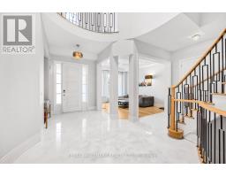 This stunning residence offers approximately 5,000 sq. ft. of luxurious living space with a rare tandem 3-car garage. The grand main floor features a soaring 21-ft hallway, elegant hardwood flooring throughout, and brand-new hardwood on the second level. Designed with 11-ft coffered ceilings, the home boasts a chef-inspired kitchen with a striking two-tone quartz waterfall island, a spacious formal dining room, a bright living room, a cozy family room with a gas fireplace, laundry on main, and a stylish powder room. Upstairs, 10-ft ceilings enhance the sense of space. Four generously sized bedrooms each include a private ensuite and walk-in closet, complemented by a media room that can easily serve as a fifth bedroom. The spa-like master retreat showcases a sun-filled half-circle sitting area, walk-in closet, and a luxurious ensuite with frameless glass showers.6 Burner Gas Miele Stove, Miele Oven, Fridge, Miele Dishwasher, Front Load Washer And Dryer. Custom Window Coverings And Luxury Light Fixtures, Security System, Interlocking Brick Drive. (id:61594)