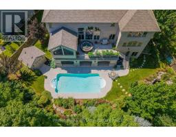 This 6,067 total sq. ft. European-inspired residence, thoughtfully designed by The Barnswallow Company, embodies timeless appeal, enduring craftsmanship, artistry, and refinement. Positioned at the top of Eagletrace Drive's prestigious cul-de-sac, this property enjoys the rare privilege of backing onto Medway Heritage Forest & ravine. The striking stone, stucco, and brick facade is complimented by a forecourt with manicured lush gardens and a sculptural water feature. The grounds unfold into a resort-style retreat with an in-ground saltwater pool, screened veranda, walkout partially screened loggia, raised terrace, serene waterfall, thriving pond, and an armour stone fire retreat, making this an extraordinary property to host. Inside, the main level exudes grandeur and warmth. The two-story great room is embellished with a cast stone gas fireplace, walnut hardwood floors, and expansive Andersen windows showcasing beautiful tree canopy views. Flow seamlessly into the expansive European-inspired kitchen, discovering embellished millwork, Cherry cabinetry, Sub-Zero fridge, Wolf, Bosch, and KitchenAid appliances, butlers pantry, kitchen pantry, breakfast nook, and a furniture style 7.4' Delicatus granite island. A formal dining room, sun-filled study, and family room with wet bar elevate the living experience. The upper level is crowned by an indulgent primary retreat - a serene, romantic sanctuary with sweeping treetop views, a lavish 6-piece ensuite with limestone, bidet & water closet, and a custom oversized dressing room with jewelry cabinetry. Three junior suites with custom closets, two with a shared 4-piece Jack & Jill, provide privacy & comfort. The lower level walkout was thoughtfully designed to bring together leisure and wellness with a recreation lounge, wet bar, sound-isolated music room, home gym with integrated sauna, craft/creative room & a thoughtfully designed in-law suite with kitchenette. Recent upgrades: Roof, furnace, AC, hot water tank (2023). (id:61594)
