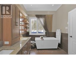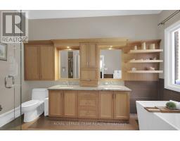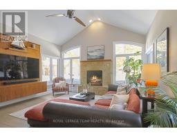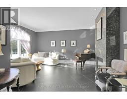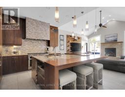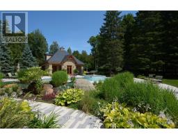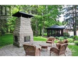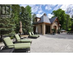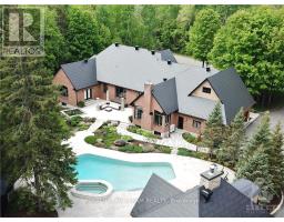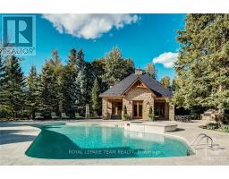 Experience the epitome of luxury living in this stunning Bungalow nestled on a private, treed & landscaped 2+ Acre lot, in prestigious Rideau Forest. Meticulously crafted, its sweeping floor plan and 10 ft ceilings are sure to impress. A state of the art kitchen with all Miele appliances including; side by side fridge/freezer, 8 burner gas stove, steamer oven, microwave/convection ovens. A raised granite hearth with gas burning fireplace in the attached family room provides the perfect ambience. Eat in area + breakfast bar. Livingroom gas fireplace with marble facade, leather look tile flooring. Family room with heated floors, formal dining room to easily accommodate seating for 12. Primary suite with custom closets plus a walk in & luxurious ensuite w/double shower and make up vanity. Exquisitely finished lower level features radiant floor heating & gas fireplace with marble facade. Spectacular entertainment area w/wet bar, fridge, dishwasher, wine cellar, extra bedroom with full ensuite bath and custom cabinetry, plus another 3-piece bath, cedar lined closet for outerwear, massive storage room w/metal shelving, home gym, & billiards area. From the kitchen/family room walk out to the professionally landscaped gardens, featuring a bubbling rock, an inground heated pool with spa, surrounded with white limestone. Enjoy the custom cedar gazebo w/ceiling fan, wired with outdoor speakers, a dining pergola, next to the outdoor bar and outdoor kitchen. Enjoy campfires at the outdoor fireplace, a commercial swing set for adults and children alike, a tree house and still a massive yard fully fenced for the kids and pets to run free. Enjoy the 3 car garage with inside access to the laundry/mud room. Metal roofs on all buildings. Bluetooth enabled permanent soffit lighting is installed. As a bonus, a 2-level finished Guest House includes a living room, kitchenette, 1.5 baths, a bedroom upstairs, plus extra storage. It's like living in your own resort. (id:61594)