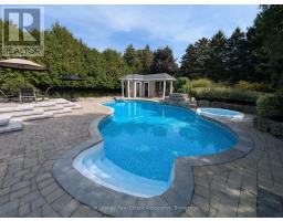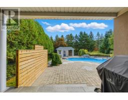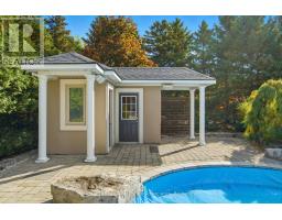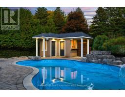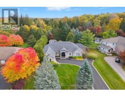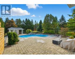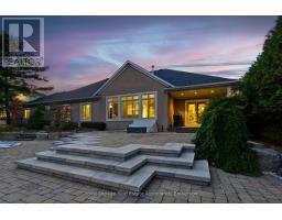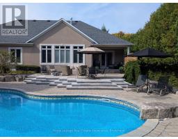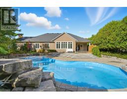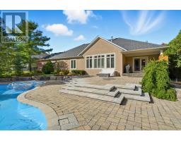 Welcome to 7 Appaloosa!This sprawling bungalow offers over 2500 square feet of finished space on one level boasting 4 bedrooms and 2 bathrooms nestled in a cul-de-sac in the sought after neighbourhood of Carlisle. Featuring 10-foot ceilings and exquisite finishes throughout, this home blends luxury and comfort in every detail. The main entrance immediately welcomes you to a grand foyer finished with tumbled marble, and offering with beautiful sight-lines highlighting your beautiful backyard. This home is filled with natural light and inviting charm. The large family room boasts hardwood flooring, California knock down ceilings, pot lights and a 2 way fireplace into your front facing formal dining room with coffered ceilings. The spacious entertainers kitchen features sharp grey cabinetry with black soapstone, centre island, built in appliances, raised breakfast bar, coffee nook, and direct back yard access. This home features a split floor plan which has the bedroom area tucked perfectly away from the living space. The primary bedroom offers a cozy retreat with its own fireplace, broadloom carpeting, spa like 5 piece en-suite and a generous walk in closet. The additional 3 bedrooms all generous in size offer walk in closets or double closets, and picture windows. The main 4 piece bath has been perfectly designed for a growing family with a massive vanity with quartz counter tops, shower tub combination and porcelain tiles. The lower level of this home awaits your finishing touches and is equipped with a rough-in for a future ensuite, offering potential for further customization. With no detail overlooked step outside to your private backyard oasis, complete with a 2 level entertaining area, covered porch for barbecuing, a salt water kidney shaped pool, and a large pool house with wet bar. (id:61594)