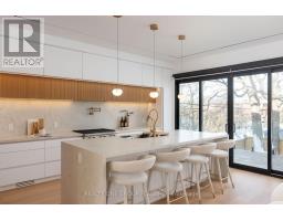 A commanding architectural statement in prestigious Stonegate-Queensway, this newly completed custom residence is thoughtfully crafted by an HCRA-licensed builder and backed by the full Tarion Warranty. Offering approx 3,650 sq ft of curated living space with 4+1 beds & 5+1 baths, the home is defined by architectural clarity, material integrity & refined restraint. A dramatic 14-ft foyer introduces interiors where soaring ceilings, wide-plank white oak floors, bespoke millwork & a fully trimless shadow-reveal design create crisp, uninterrupted lines and a gallery-like atmosphere, enhanced by layered architectural lighting throughout. A sculptural floating mono-beam staircase wrapped in ultra-clear glass rises as a striking focal point, while a porcelain feature wall with a 3-sided fireplace anchors the principal living space with warmth & presence. The chef's kitchen showcases a waterfall porcelain island, handcrafted fluted cabinetry & a professional Sub-Zero & Wolf appliance suite seamlessly integrated into the design. Expansive walls of glass & 9 skylights draw natural light across every level, complementing curated interior illumination and heightening the home's sense of scale and calm. Integrated Control4 automation provides effortless control of lighting, audio, security & motorized window coverings. Upstairs, the primary retreat offers boutique-hotel serenity with custom millwork, a generous walk-in closet & a spa-inspired ensuite finished in rich porcelain & refined fixtures, while each add'l bedroom enjoys ensuite access. The bright walk-up lower level continues the architectural narrative with 10-ft ceilings, a bespoke wet bar, rec lounge, add'l bedroom & full bath. A bold contemporary façade defined by aluminum panel detailing, precision fluted elements & architectural exterior lighting, complemented by professional landscaping, completes this architecturally refined modern residence mins to top schools, waterfront trails, Mimico GO & downtown Toronto. (id:61594)