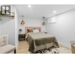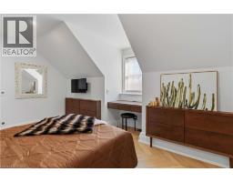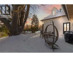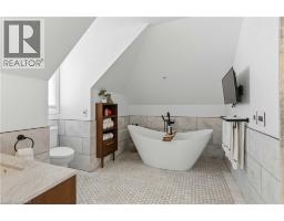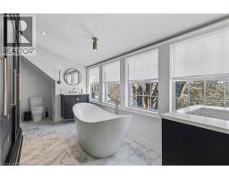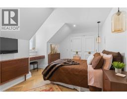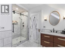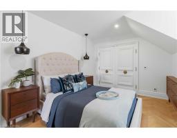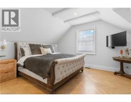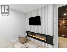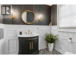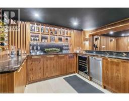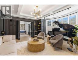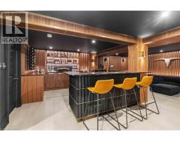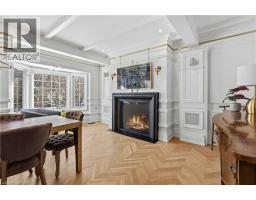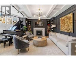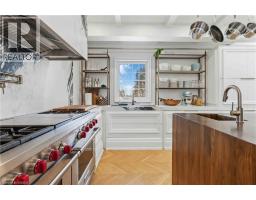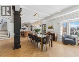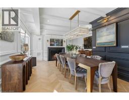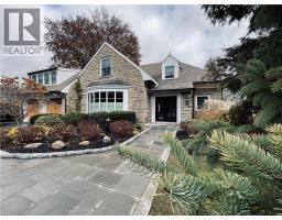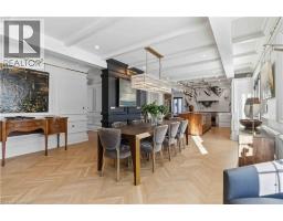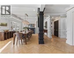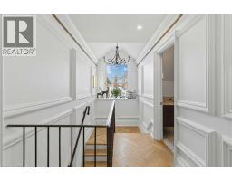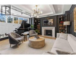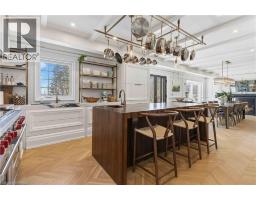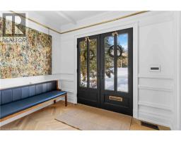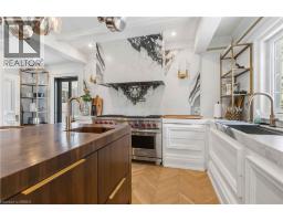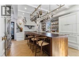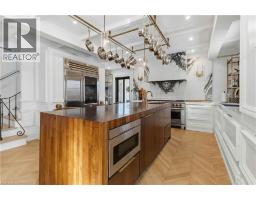 This exceptional two-storey stone & brick residence is a rare designer-owned masterpiece on a mature estate lot blending classic architecture with bold luxury. Dark doors lead to an awe-inspiring hallway with raised paneling, hand-carved exposed beams, & a striking black accent wall. The living room's built-in cabinetry frames a real wood fireplace perfect for intimate gatherings, fireside evenings, or musical moments under the brass chandelier and tray ceiling. The chef-inspired kitchen shines with timeless cabinetry topped in subtly veined marble porcelain and custom-designed brass open shelving wrap a solid walnut island featuring a 3” thick end-grain top comprised of 1690 pieces. A rare 60” duel-fuel Wolf range, 48” Subzero Pro48 glass-front refrigerator would delight even the most discerning chef. The dining room is centred around a 42” fireplace that serves as a dramatic focal point. The herringbone hardwood floors flow seamlessly from adjacent areas, refined lighting, and large windows with garden views enhancing the sense of openness & tranquil luxury. Ascend to the primary suite retreat, where a show-stopping fireplace-clad in intricate black geometric paneling-serves both the bedroom & spa-like ensuite. A freestanding oval tub overlooks the yard. Custom wardrobes with built-in ensuite laundry, heated floors, & sloped ceilings with hand-hewn oak beams & an upholstered seated dressing area a& 40 sq/ft shower leave no reason to leave its’ truly luxury hotel vibe. The finished basement includes a home theatre/media room paired with a stylish bar area. Throughout, moody built-in lighting accents the walnut & solid brass details creating a speak-easy hotel environment. This is more than a home; it’s a curated lifestyle of high-end craftsmanship, bold personality & effortless sophistication. Every element has been intentionally designed & custom-crafted, resulting in a truly one-of-kind home that balances timeless historic character with modern function. (id:61594)