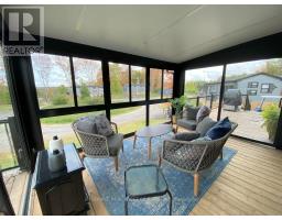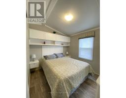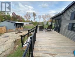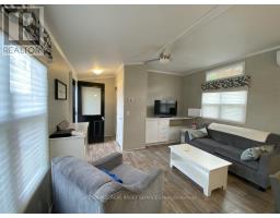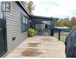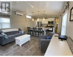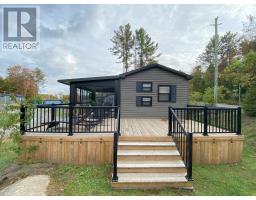 Rare Find at the Resort! Step into extra space and comfort with this 3-bed, 1-bath Northlander Heron - a rare 14-ft wide park model that offers the elbow room most cottages can't. Designed for entertaining, it features a bright open-concept living area with large sliding glass doors, stainless steel appliances, bar-height counters, and a built-in entertainment cabinet with TV. Fully furnished (yes, everything stays - furniture, appliances, patio set, deck chairs!), the layout is perfect for families: Queen in the master, double in the third bedroom, and twin bunks in the second for kids or guests. Outside, enjoy peak-a-boo lake views from your wrap-around deck with stylish aluminum and glass railings, plus a custom glass sunroom to make the most of rainy days. Tucked away on a quiet cul-de-sac in our newest development, this cottage is a rare opportunity for those looking for both comfort and style at a fantastic price point.*For Additional Property Details Click The Brochure Icon Below* (id:61594)